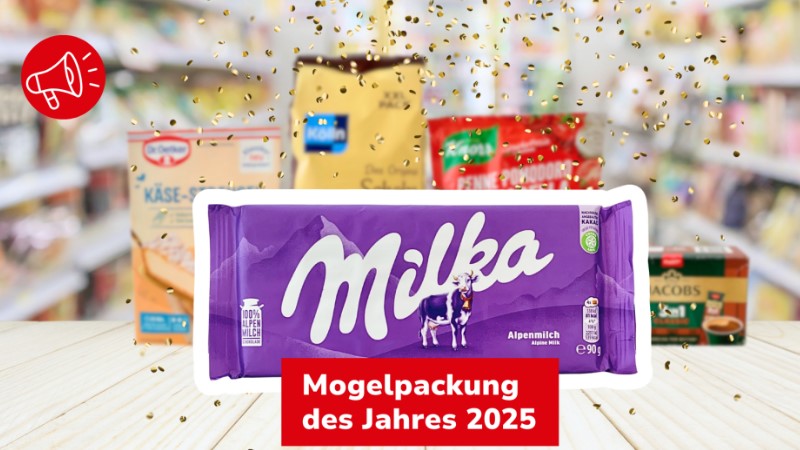 Mit eindeutigem Ergebnis haben Verbraucherinnen und Verbraucher die Milka Alpenmilch Schokolade zur »Mogelpackung des Jahres 2025« gewählt.