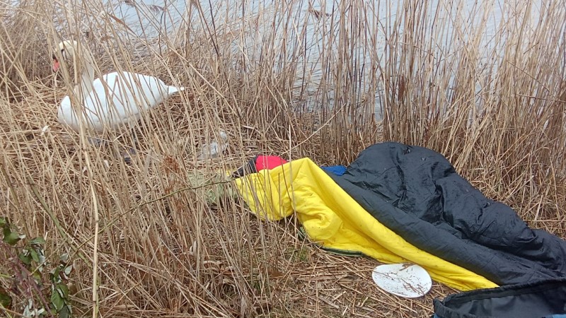 Das Ufergebiet an der Kiesgrube Leuben wird gerne mal als Müllhalte oder Zeltlager mißbraucht. Dabei gibt es keine Achtung vor der Natur und den Tieren. Aktuell sitz ein Schwan auf einem Nest.