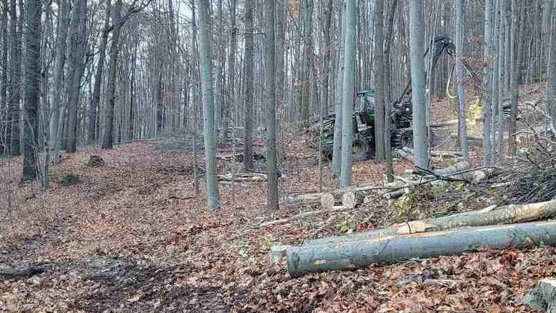 Im Rahmen der Durchforstung werden unter anderem bruchgefährdete Fichten entfernt, die durch Borkenkäferbefall abgestorben sind.
