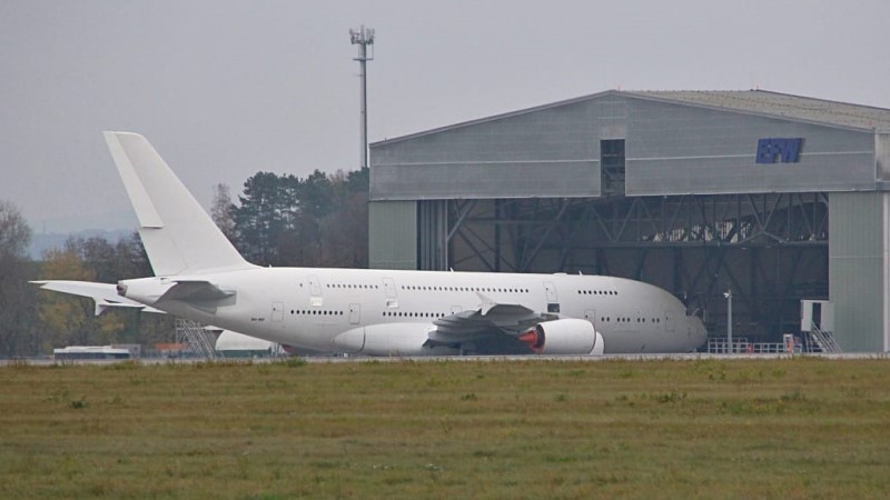 Einen kompletten weißen A380 in Dresden kannte man so noch nicht. Doch das Flugzeug ist ein alter Bekannter! Er landete bereits am 17. September 2025 in Dresden. Am Samstag wurde er in die Halle gezogen.