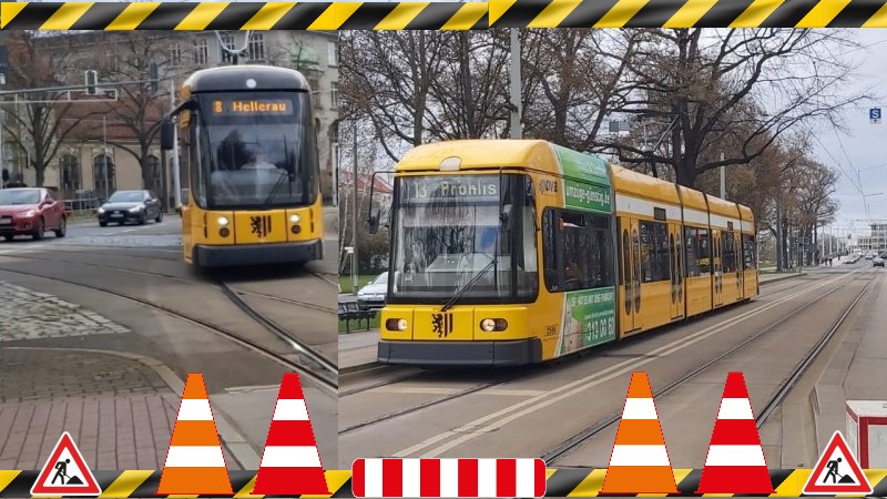 Aufgrund von Gleisbauarbeiten an der Sachsenallee erhalten die drei Straßenbahnlinien 6, 8 und 13 von Dienstag, dem 7. April 2026, 4:00 Uhr bis Dienstag, den 21. April 2026, 3:00 Uhr eine geteilte Linienführung