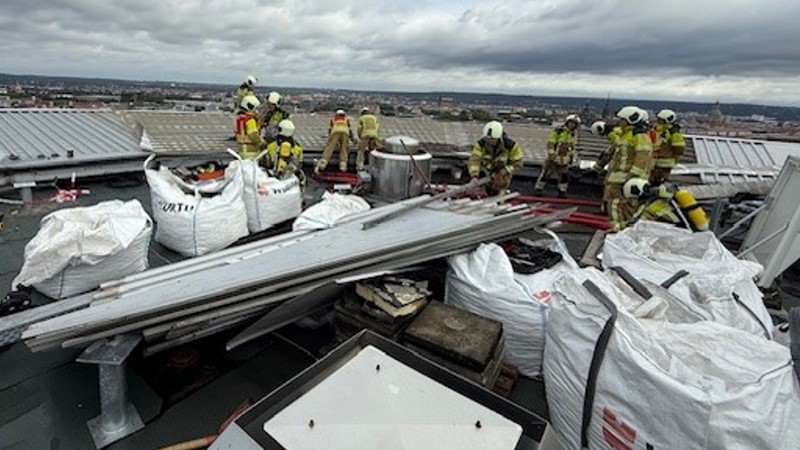 (ots) Die Feuerwehr Dresden ist derzeit mit rund 50 Einsatzkräften bei einem Brand auf dem Dach des World-Trade-Centers im Einsatz. Aus bisher ungeklärter Ursache gerieten bei Bauarbeiten Teile der Dachdämmung in Brand.